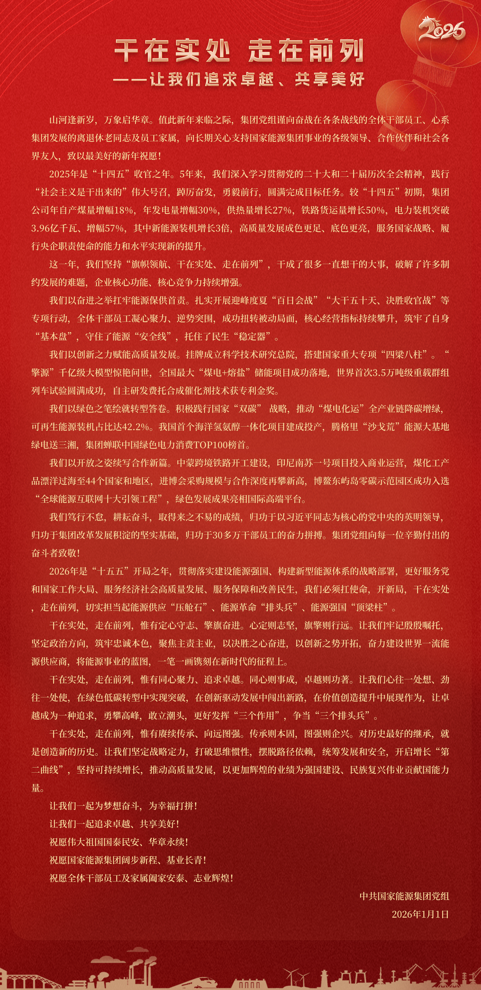 國家能源集團(tuán)胸懷“國之大者”,增產(chǎn)增供、穩(wěn)價(jià)穩(wěn)市,積極服從服務(wù)國家戰(zhàn)略、保障國家能源安全、助力國民經(jīng)濟(jì)穩(wěn)增長,推動煤炭安全綠色智能、煤電清潔高效穩(wěn)定、現(xiàn)代煤化工高端多元低碳、運(yùn)輸物流協(xié)同一體、新能源多元?jiǎng)?chuàng)新規(guī)?;l(fā)展,全力擔(dān)當(dāng)能源強(qiáng)國頂梁柱,能源供應(yīng)壓艙石,能源革命排頭兵。